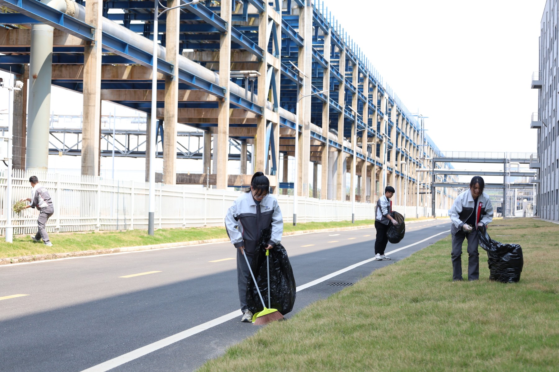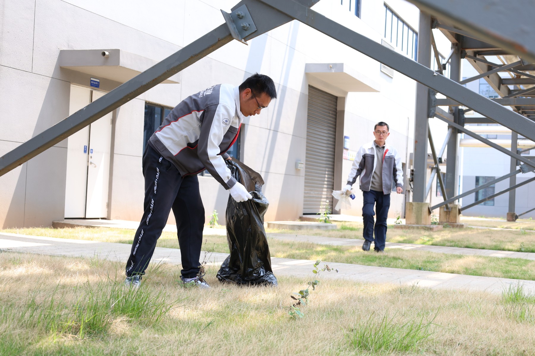 第二组认真清扫蹊径、草坪等公共区域的垃圾,他们拿着扫帚、垃圾袋等工具,穿梭在厂区的各个角落,无论是隐藏在草丛中的瓶子,照旧散落在蹊径上的纸屑,都逃不过他们的火眼金睛。