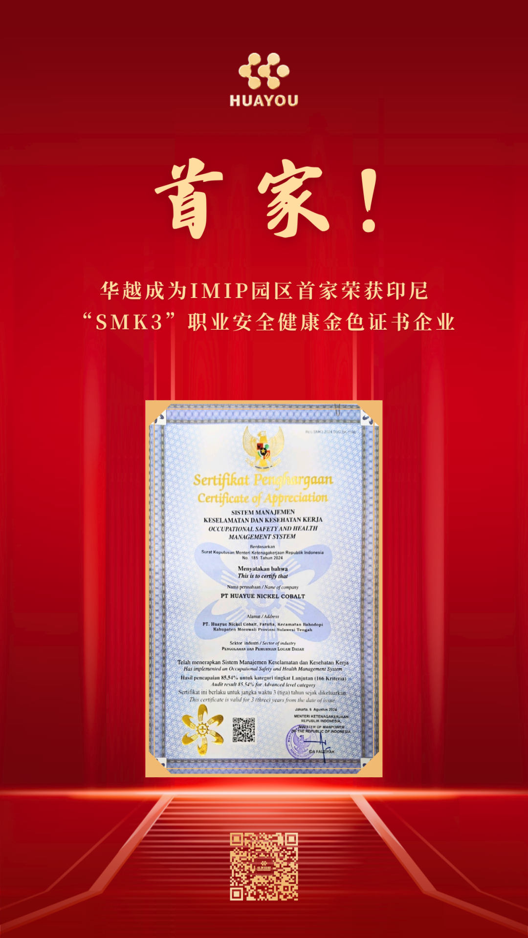 9ÔÂ9ÈÕ£¬»ªÔ½ÄøîÜ£¨Ó¡ÄᣩÓÐÏÞ¹«Ë¾Õýʽͨ¹ýÉóºË£¬»ñµÃÓ¡ÄáÀ͹¤²¿½ÒÏþµÄ¡°SMK3Ö°ÒµÇå¾²¿µ½¡¡±½ðÉ«£¨×î¸ßÆ·¼¶£©Ö¤Ê飬³ÉΪIMIPÔ°Çø50¶à¼ÒÆóÒµÖÐÊ×¼Ò»ñ´ËÈÏÖ¤µÄÆóÒµ¡£